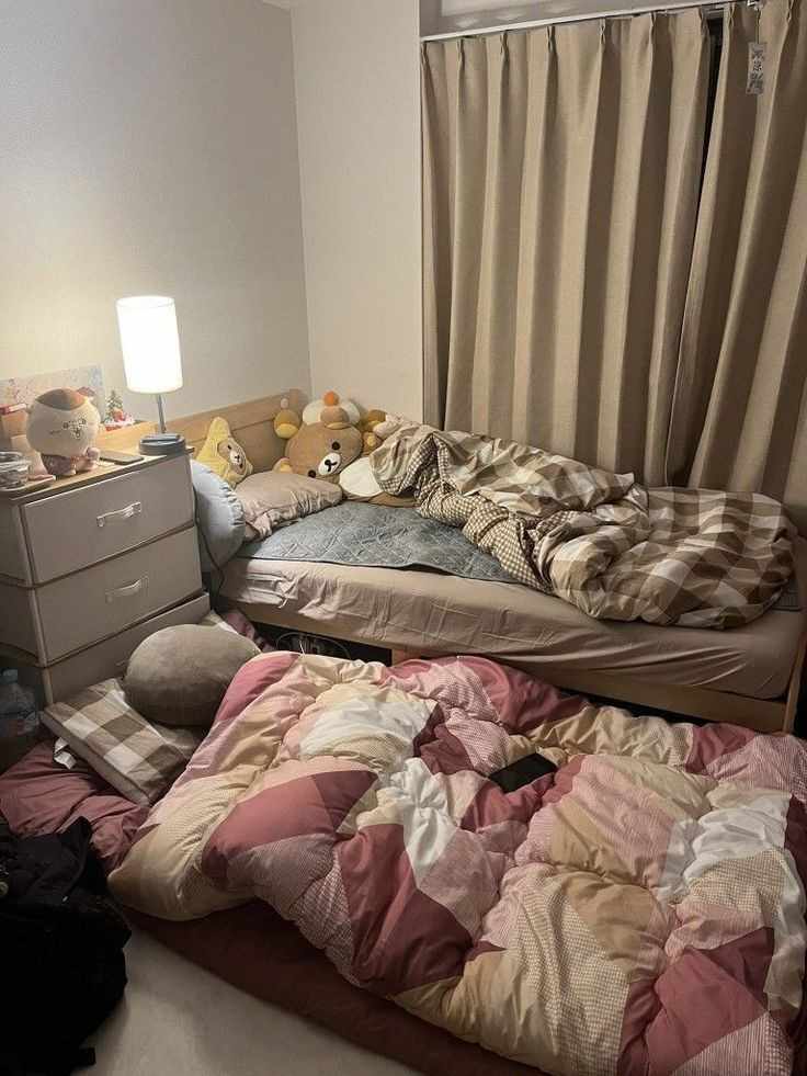 The messed up set of bed and thrumbled laid bed set-up just next to the one-person bed was just as messy as the other one.